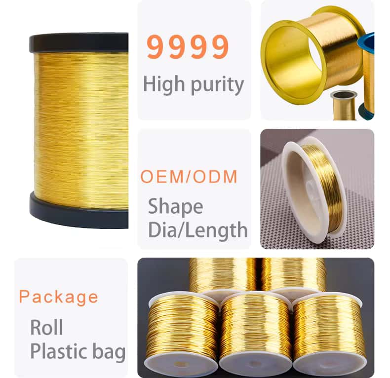 Gold wire is produced by drawing and bonding Au material with a purity of over 99.99%, containing trace elements like Ag/Cu/Si/Ca/Mg.
