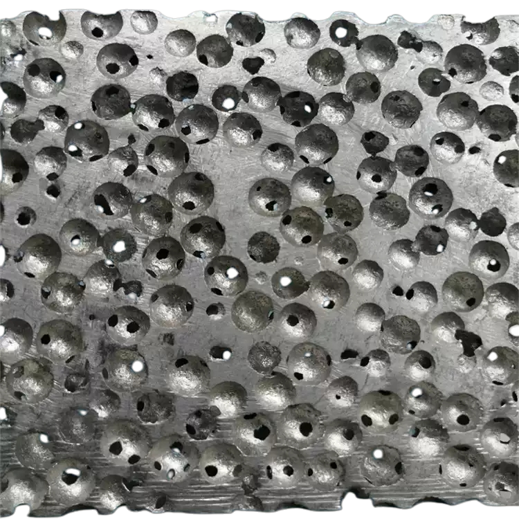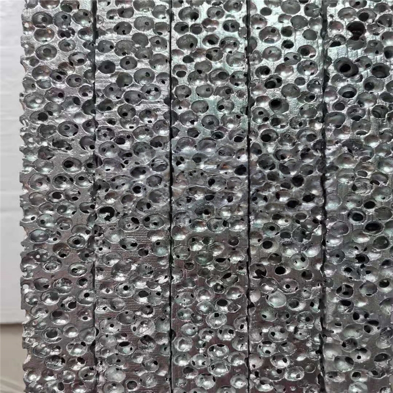 As for spherical aluminum foam, its bubble chamber is spherical and relatively regular. The bulkhead is provided with small round holes to connect with the sphere, and the holes are divided into six directions to avoid straight through holes, which is conducive to sound absorption, filtering and noise elimination. In practical application, the ideal application effect can be obtained by designing and controlling the ball size (diameter 4-13mm), wall hole size (diameter 0.5-4mm), hole wall thickness and plate thickness. Bulk density: 0.5-0.8g/cm3. The national building materials testing center of the Ministry of construction has identified that the noise reduction coefficient of spherical aluminum foam exceeds international standards. The spherical foamed aluminum products produced by our company is a kind of material that combines the advantages of open holes and closed holes to overcome the shortcomings of open holes and closed holes.